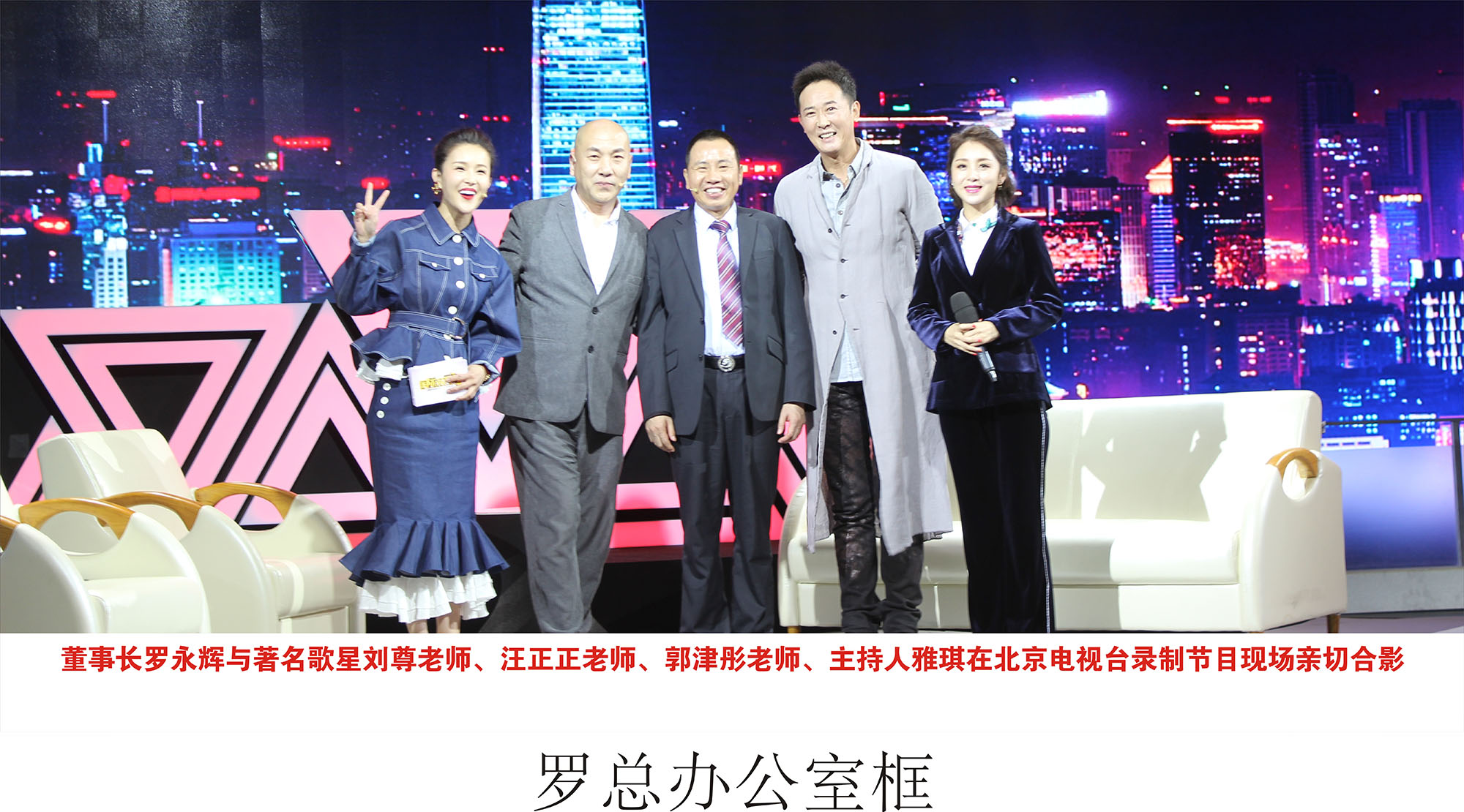 新望董事長羅永輝與著名歌星劉尊老師、汪正正老師、郭津彤老師、主持人雅琪在北京電視臺錄制節目現場親切合影